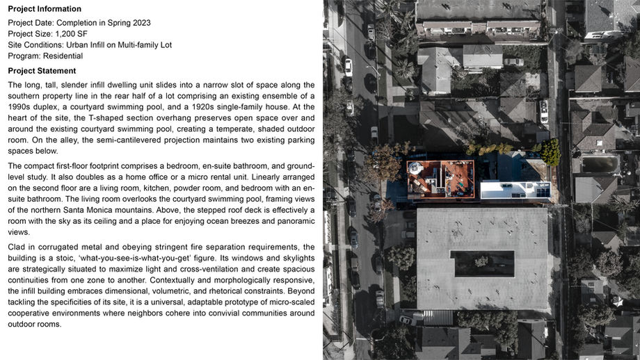 A 2-story/1,169 SF/13'-0" wide x 57'-0" long building, it carefully tiptoes in its zone to preserve a courtyard swimming pool and two alley-facing parking spaces. At ground level, the compact footprint comprises a bedroom, en-suite bathroom, and a study. In a sense, it is a micro-unit in and of itself. Linearly arranged on the first floor are the living room, galley kitchen, and bathroom with en-suite bathroom so that the living room overlooks the immediate courtyard and the mountains to the north. Above is a stepped roof deck from where inhabitants enjoy near and distant views and the ocean breeze.